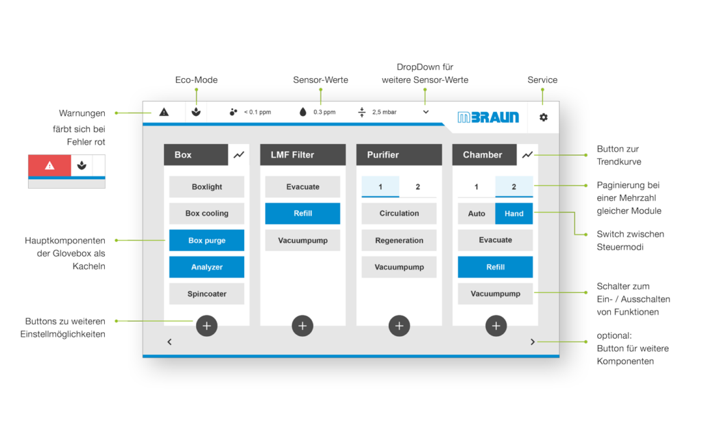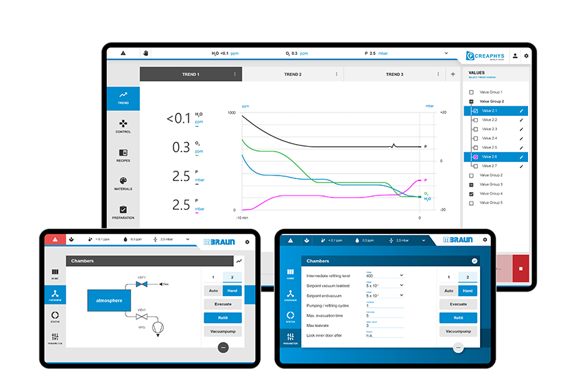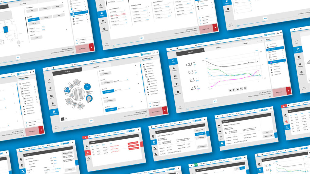 Aufbauend auf unserer erfolgreichen Zusammenarbeit im Produktdesign für Creaphys wurden wir beauftragt, die beiden sehr unterschiedlichen Benutzeroberflächen von MBraun und Creaphys zu harmonisieren und eine gemeinsame HMI Design-Richtlinie zu entwickeln. Dazu gehörten Workflow-Optimierung, Strukturentwicklung, Wireframing, Prototyping, UI-Designentwicklung und Umsetzungsbetreuung. Die Herausforderung bestand darin, Systeme mit unterschiedlicher Komplexität, Struktur, Bedienlogik und Programmierbasis zusammenzuführen.